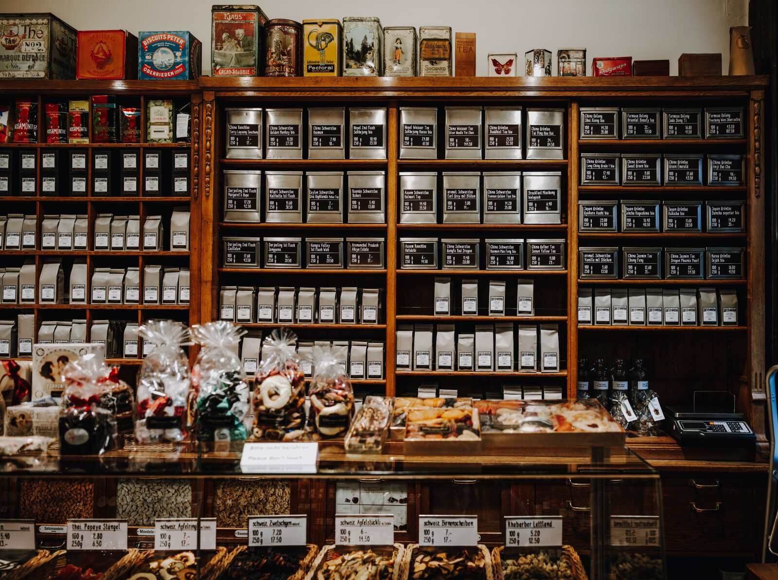 nach Tee und Kakao, nach getrockneten Aprikosen, Feigen und Pflaumen, nach Zimt, Kardamom und Trockenkräutern. Es riecht nicht bloss «nach Kaffee», sondern nach Rohstoffen, nach Arbeit und nach Reisen. Dazu kommt ein eigenes Klangbild: das Rascheln der Papiersäcke, das Rieseln der Bohnen über der Waage, das Klirren der Gläser und das feine Klicken der alten Messinggewichte. Die Farben sind erdig und tief, die Formen funktional und ehrlich. Man entscheidet hier nicht nach Etikett, sondern nach Geruch, Erklärung und Gefühl. Viele dieser Eindrücke entstehen nicht bewusst, sondern durch das Nebeneinander von Dingen, die seit Jahrzehnten aufeinander abgestimmt sind. Es ist kein Design, und doch entsteht Ästhetik. Es ist kein Museum, und doch wirkt es historisch. Und es ist kein Showroom, und doch ist es ein Ort, den man sich merkt.